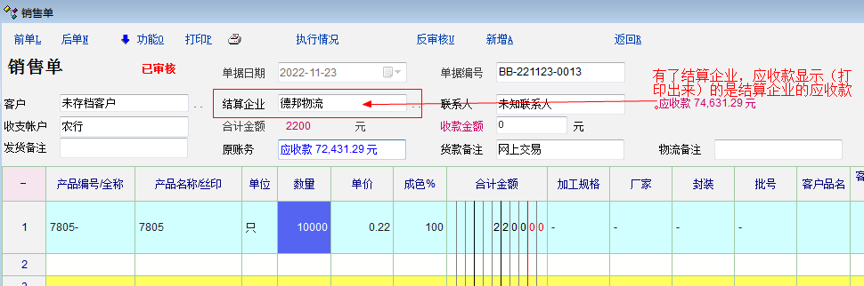 应该同时分别显示销售(采购)客户的账务信息和结算企业的账务信息。