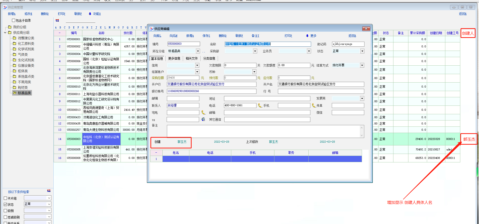 优化完善:供应商列表显示时,增加创建人 显示为人员名称。  详细看图。