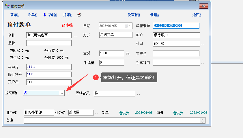 3. 单据审核后修改, 不生效。 重新打开又是原值。