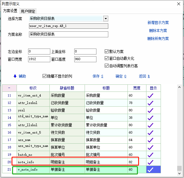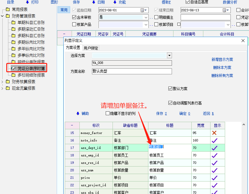 建议首先增加单据备注。 用脚本数据量大,会很慢如下: int show_row_ext() { string v_id,v_no,sql; v_id=grid_get_v('MG','voucher_no',change_row_id); sql="select note_info from ebs_v where voucher_no='"+v_id+"'"; db_run(sql); v_no=db_res(0); grid_set_v('MG','v_note_info',change_row_id,v_no); return 1; }; 下面的脚本,数据超过600条又显示不齐 int load_over() { int i,x,n,y; string a,b,c,d,v_id,sql; v_id=''; n=grid_row_num("MG"); for(i=1;i<n;i++){ a=grid_get_v("MG","voucher_id",i-1); b=grid_get_v("MG","voucher_id",i); if(a!=b) v_id=v_id+grid_get_v("MG","voucher_id",i)+','; }; v_id=str_get_sub(v_id,0,strlen(v_id)-1); sql="select voucher_id,note_info from ebs_v where voucher_id in ("+v_id+")"; db_run(sql); y=db_row_count(); for(x=0;x<y;x++); { c=db_cell_ext("voucher_id",x); d=db_cell_ext("note_info",x); for(i=1;i<n;i++){ b=grid_get_v("MG","voucher_id",i); if(b==c) grid_set_v("MG","v_noteinfo",i,d); }; }; return 1; }; |