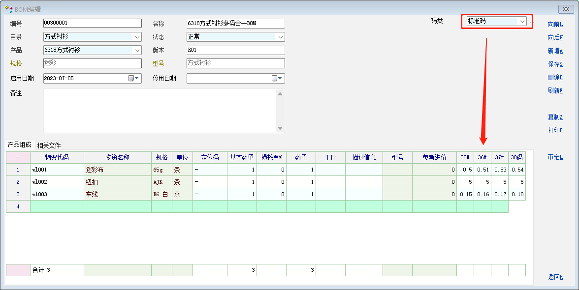 更详细的来了。 如果支持attr扩展,则不需要二次保存,二次加载 1、建立一个产品编号,按颜色。 2、建立码段及码数字典 3、使用扩展字段,动态显示码数 4、保存后再次脚本保存码数 5、显示时,再次加载脚本保存的码数 好处: 1、可以少建产品 2、在BOM里可以少建BOM 3、在采购里可以更简洁的,原先要一码一颜色,如果20个码,则要20行,现在则需要1行。 extern change_obj; int csm() { string sql, md; md = gui_get_val("ext_Ext1"); int a, b; for (a = 0; a < 35; a++) { grid_set_v("MG_Composing", "a" + a, 0, ""); grid_set_col_width("MG_Composing", "a" + a, 0); } if (md != "") { db_free_cur_area(); db_copy_from_dt(md); b = db_row_count(); for (a = 0; a <= b; a++) { grid_add_col_num("MG_Composing", db_res(0), db_res(1)); grid_set_v("MG_Composing", db_res(0), 0, db_res(1)); grid_set_col_width("MG_Composing", db_res(0), 35); db_next(); } } return 1; } int func_edit_rec() { //msg('edit rec'); csm(); //二次加载 return 1; }; int func_after_save() { //二次保存 string sql, vql, bom_id, mdc; int a, b, c, d; bom_id = gui_get_val("Edit_Bom_Id"); sql = "delete from u_res_bom_item_attr where bom_id='" + bom_id + "'"; b = grid_find("MG_Composing", "res_id", ""); for (a = 1; a < b; a++) { sql = "insert into u_res_bom_item_attr(bom_id,pcode,a1,a2,a3,a4,a5,a6,a7,a8,a9)values('" + bom_id + "'," + grid_get_v("MG_Composing", "pcode", a); for (c = 1; c < 10; c++) { vql = vql + ",'" + grid_get_v("MG_Composing", "a" + c, a) + "'"; } db_run(sql + vql + ")"); vql = ""; } } int obj_change() { csm(); return 1; }; |