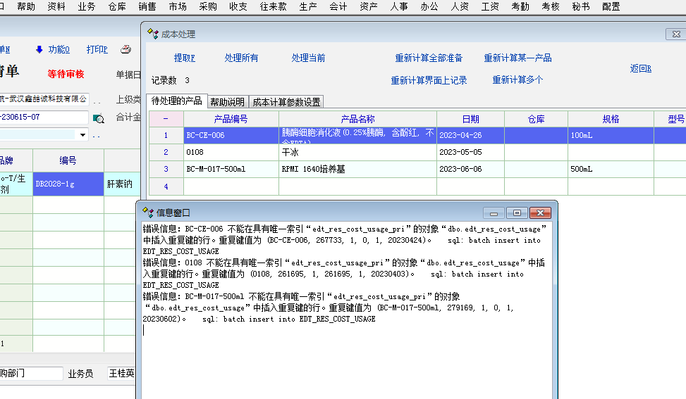 场景:成本处理时,当提示 唯一索引 错误时,需求客户手工点 重新计算界面上记录,自动定时处理成本每次还检查是不是有异常