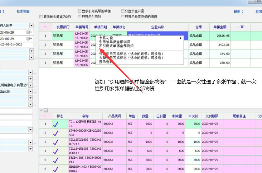 单据列表右键添加引用选择的单据(多单单据)全部物资----方便一次性选择多张单据