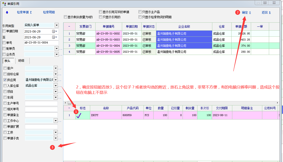 列表里面选择单据,点击确认按钮不方便----目前发现很多客户的电脑都没法去自动适应这个界面(确认)按钮经常不显示,造成使用人员无法选择,而且打勾位子与最后确认位子距离相差太远,使用起来不方便