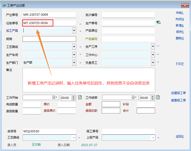 新建工序产出记录时,输入相关的任务单号后回车,带不出任何信息,建议新增工序产出记录时,可以根据任务单号带出相关的产品信息。