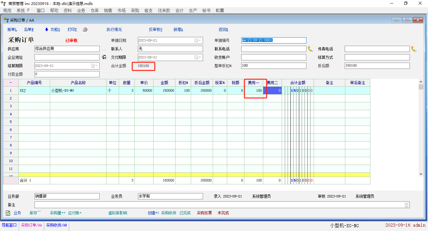 1、采购订单:录入采购3台电脑,运费付款:100元,然后在 分配费用一 填写:100