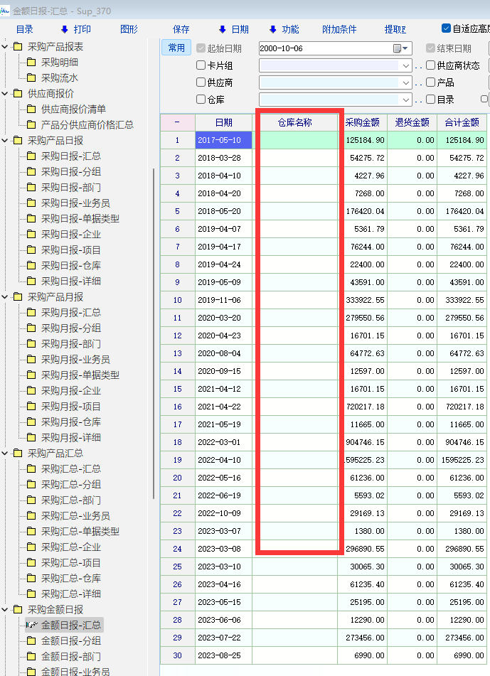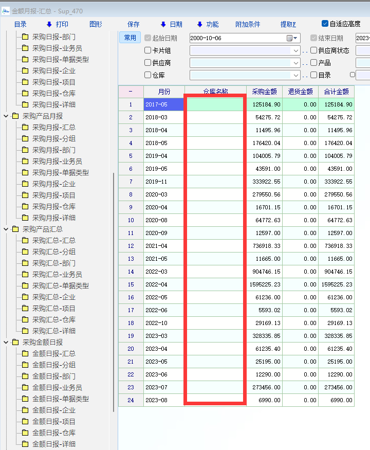 最新版本你前面几张报表是没有仓库列的,你是不是自己加的列。升级到最新版本,删除显示定制方案试试。