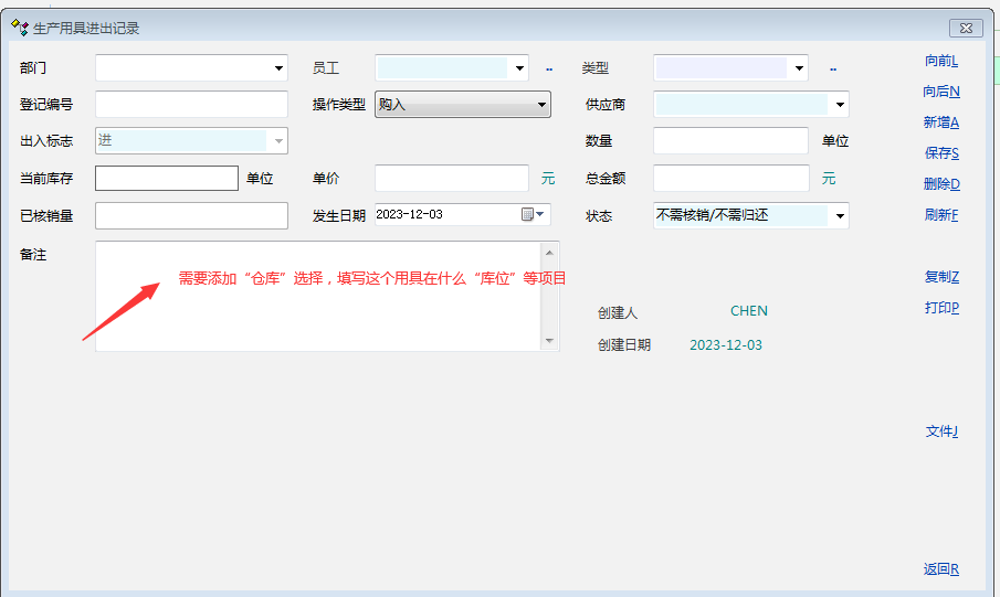 好的,存放位置在用具定义界面里输入,下次发布版本会在进出界面上加以显示。