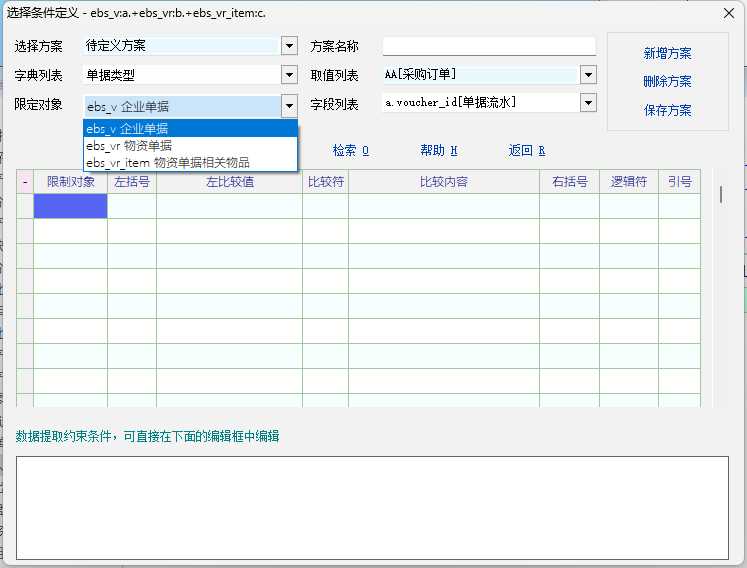 2. 增加报表中的附加条件 , 将单据 ebs_v, ebs_vr, ebs_vr_item, ebs_v_attr 加入到报表中