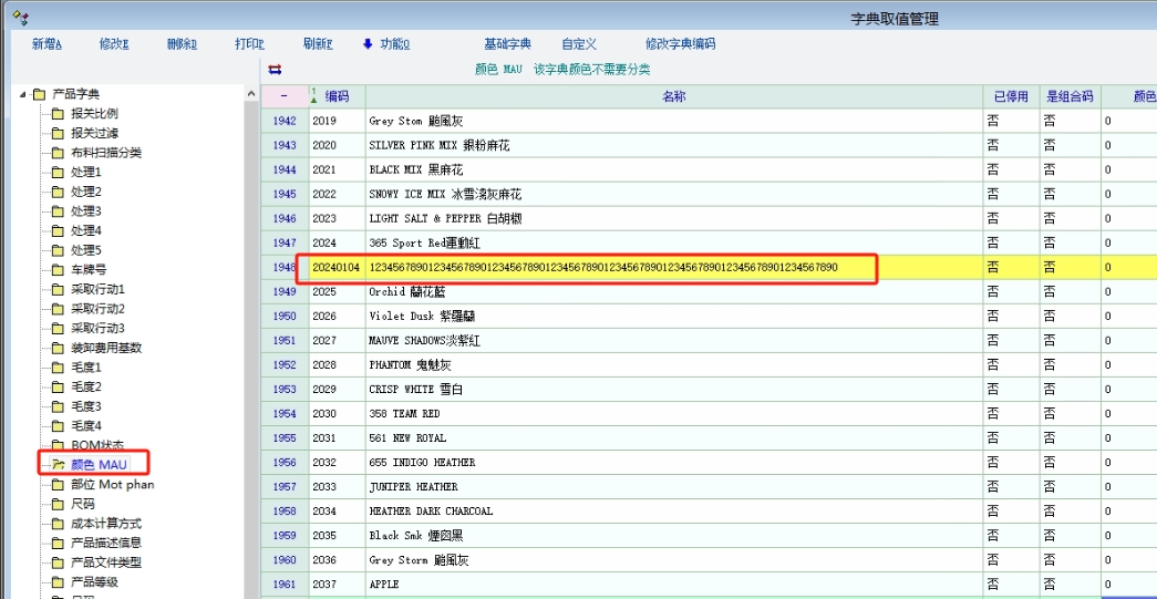 在产品资料》功能》更多功能》相关字典定义》这里添加一个颜色字典,设置一个行业属性为颜色,类型:字典型,字典选择你添加的这个颜色字典,然后把所有已有的颜色导入到这个字典,后续有新的就新增进来即可,这里测试是可以录入80个字节