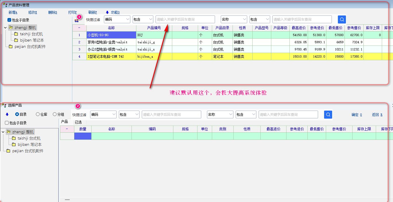 当前系统默认是关键词超级大查询,比如在 产品定义列表里、在单据表格的名称列里或是产品选择界面的关键词查询里。
