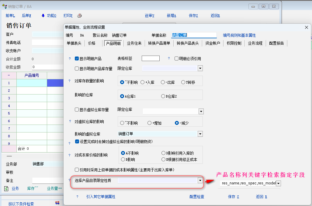3、在单据的 产品名称  列当输入关键字时的模糊查询,建议在单据的配置 里增加一个 名称查询指定字段 的设置