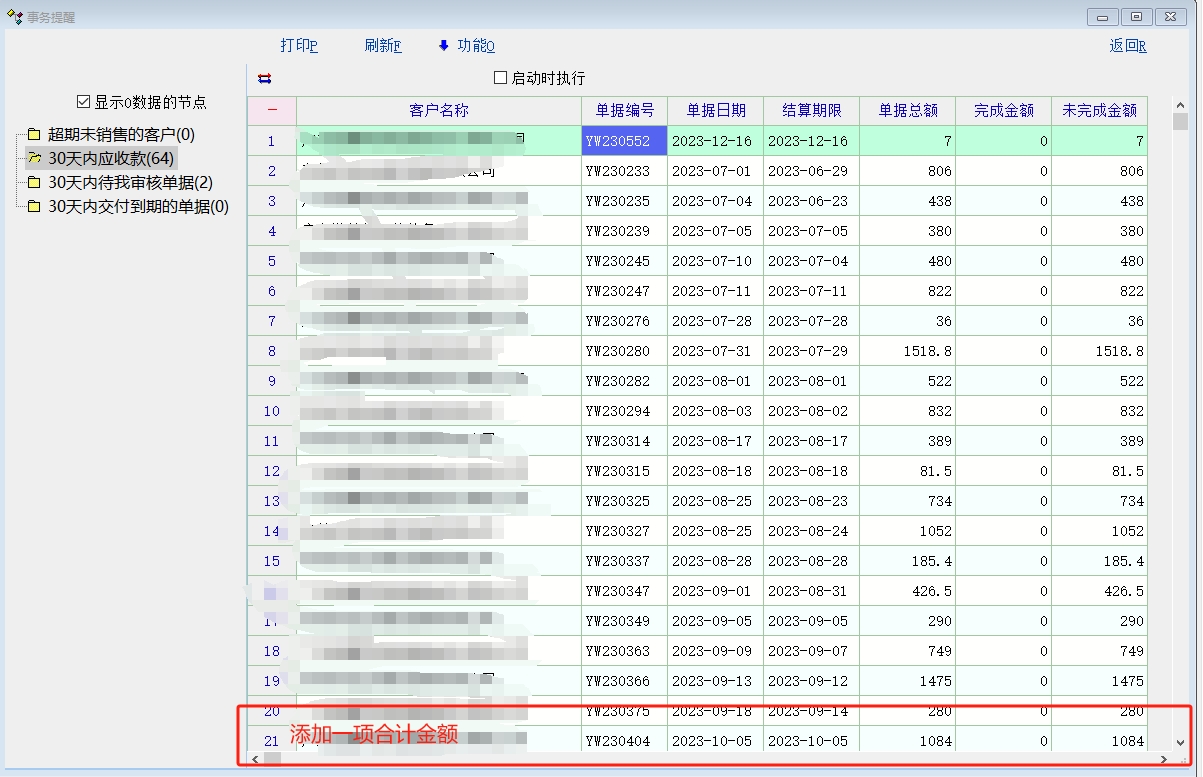 可否在事务提醒-应收款项底下添加一行合计金额项