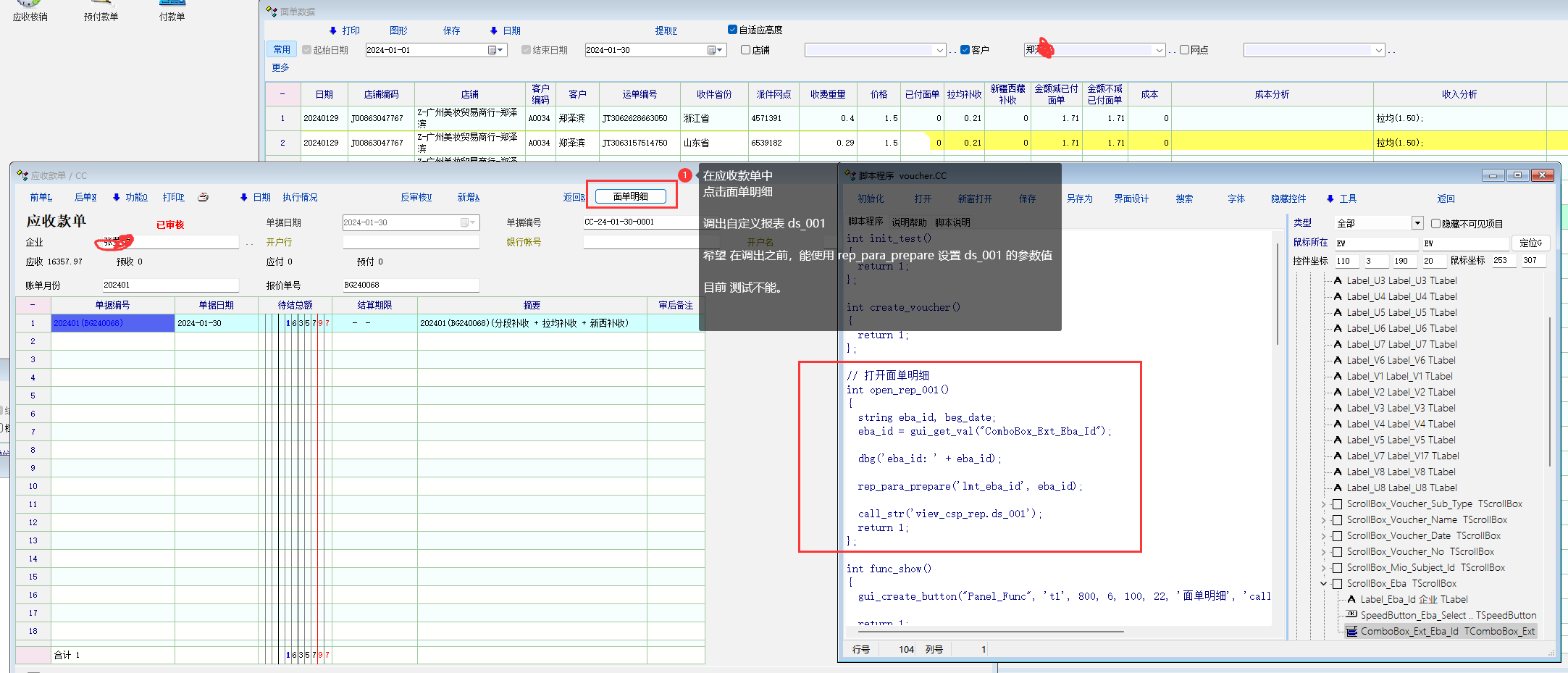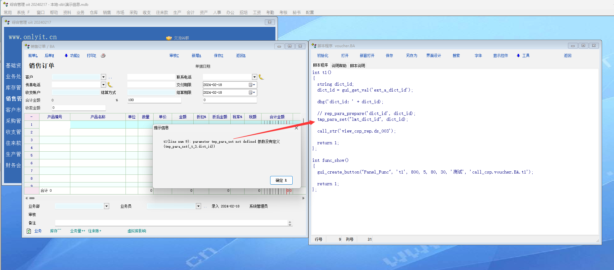 int t1() { string dict_id; dict_id = gui_get_val('ext_a_dict_id'); dbg('dict_id: ' + dict_id); // rep_para_prepare('dict_id', dict_id); // para_set('dict_id', dict_id); pub_para_set('dict_id', dict_id); call_str('view_csp_rep.ds_003'); return 1; }; int func_show() { gui_create_button("Panel_Func", 't1', 800, 5, 80, 30, '测试', 'call_csp.voucher.BA.t1'); return 1; }; 目前测试提示没有 tem_para_set, 测试下面2个函数也不行。 // para_set('dict_id', dict_id); pub_para_set('dict_id', dict_id); 是不是要在后续版本中增加 temp_para_set |