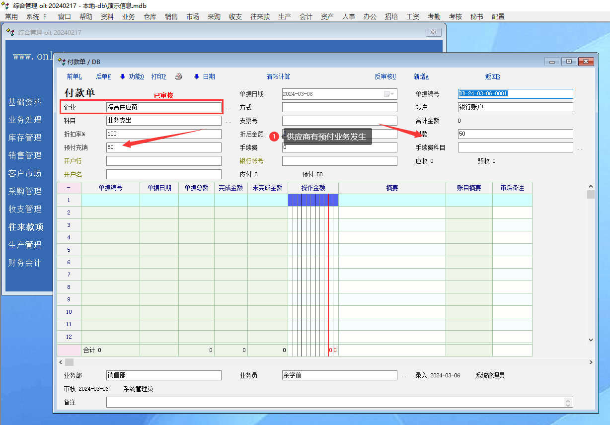 操作场景: 今天 有个客户, 做了付款单, 然后又直接删除了供应商. 我用演示数据库重现了一下过程 供应商还没有发生业务单据, 填制了往来付款单中的付款单. 然后供应商中本来是要删除文件的, 点击到了卡片的删除按钮, 居然把供应商删除掉了. 所以建议: 供应商删除时, 检测是否有往来单据, 有往来单据也不能删除. 否则很容易造成以前的单据中供应商显示不正常了. |