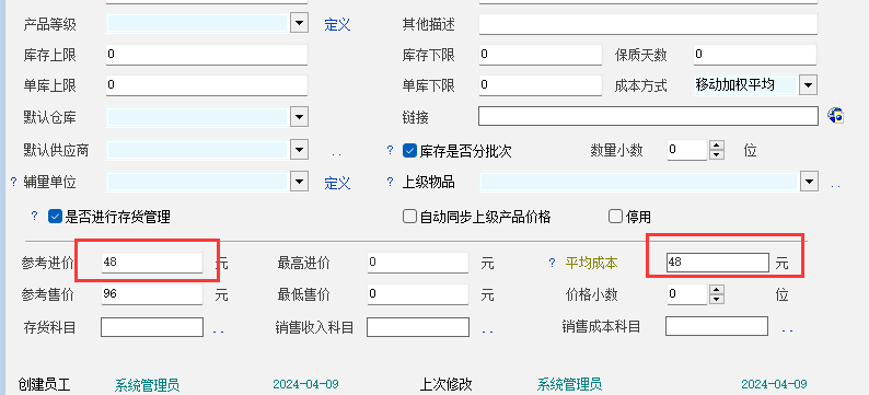 下图为新增产品资料时   填写完参考进价   平均成本就自动填写了