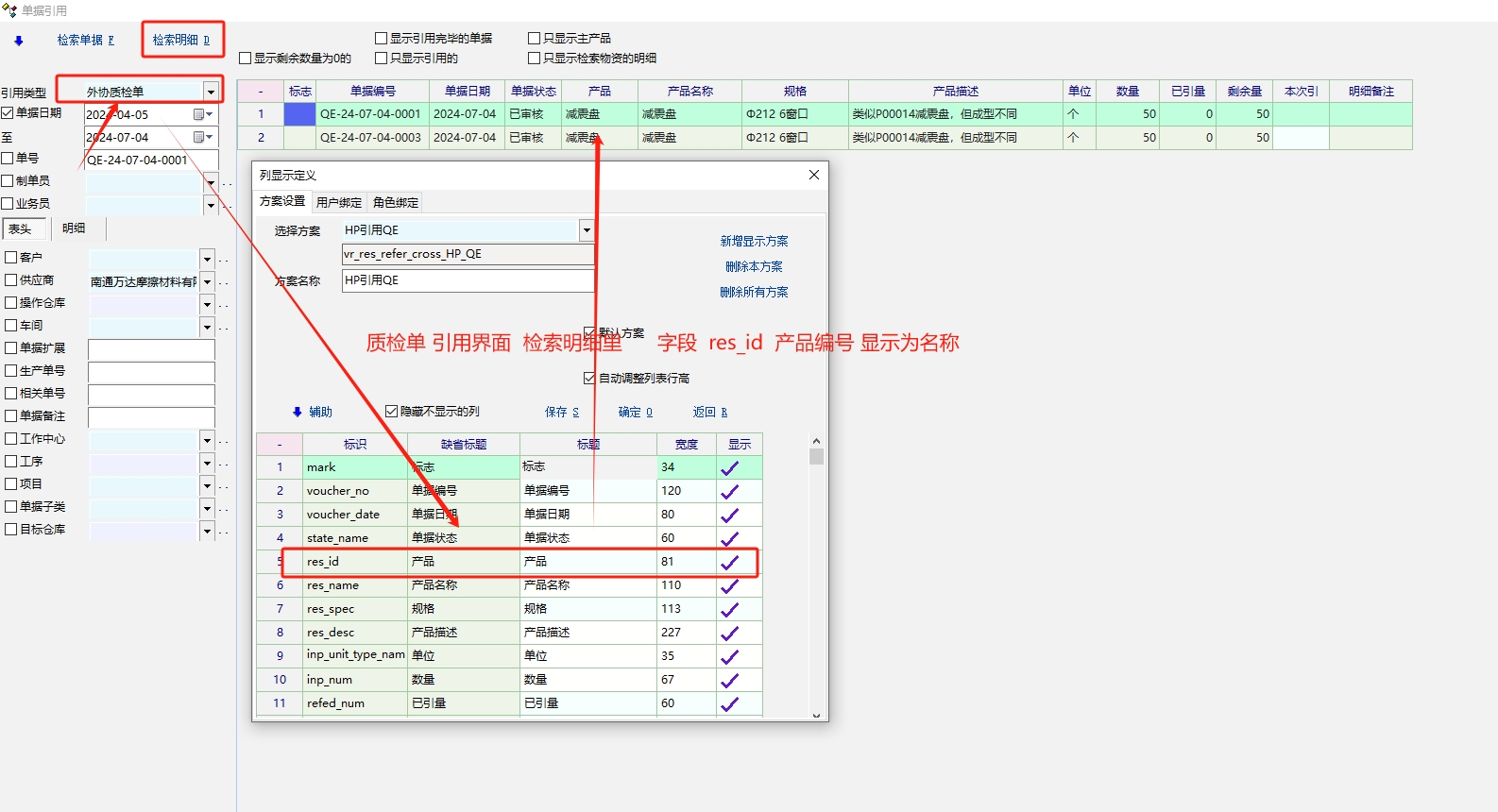 质检单据引用界面   检索明细 产品编号显示为产品名称