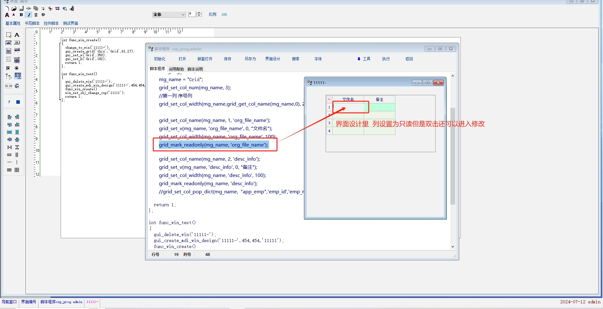 int func_win_create() { change_to_win('11111-'); gui_create_grid('this','Grid',61,27); gui_set_w('Grid',350); gui_set_h('Grid',182); string mg_name; mg_name = "Grid"; grid_set_col_num(mg_name, 3); //第一列 序号列 grid_set_col_width(mg_name,grid_get_col_name(mg_name,0), 20); grid_set_col_name(mg_name, 1, 'org_file_name'); grid_set_v(mg_name, 'org_file_name', 0, "文件名"); grid_set_col_width(mg_name, 'org_file_name', 100); grid_mark_readonly(mg_name, 'org_file_name'); grid_set_col_name(mg_name, 2, 'desc_info'); grid_set_v(mg_name, 'desc_info', 0, "备注"); grid_set_col_width(mg_name, 'desc_info', 100); grid_mark_readonly(mg_name, 'desc_info'); //grid_set_col_pop_dict(mg_name, "app_emp",'emp_id','emp_name'); return 1; }; int func_win_test() { gui_delete_win('11111-'); gui_create_mdi_win_design('11111-',454,454,'11111'); func_win_create() win_set_obj_change_csp('11111'); return 1; }; int main() { func_win_test() return 1; }; |