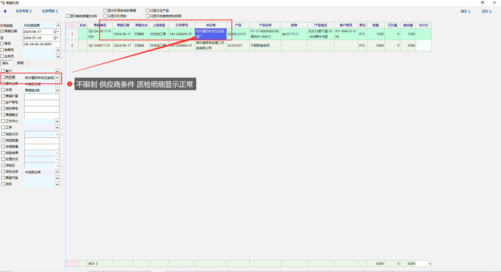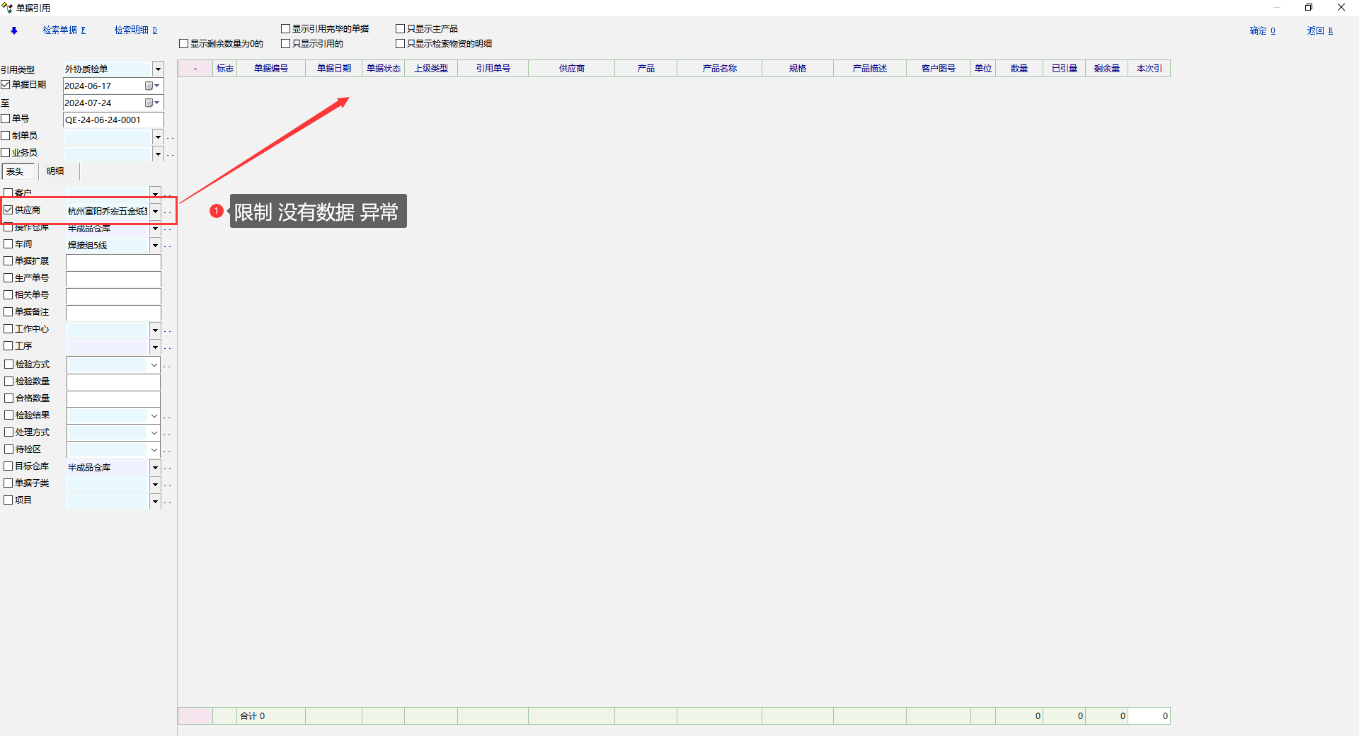 单据引用质检单界面-供应商限制失效