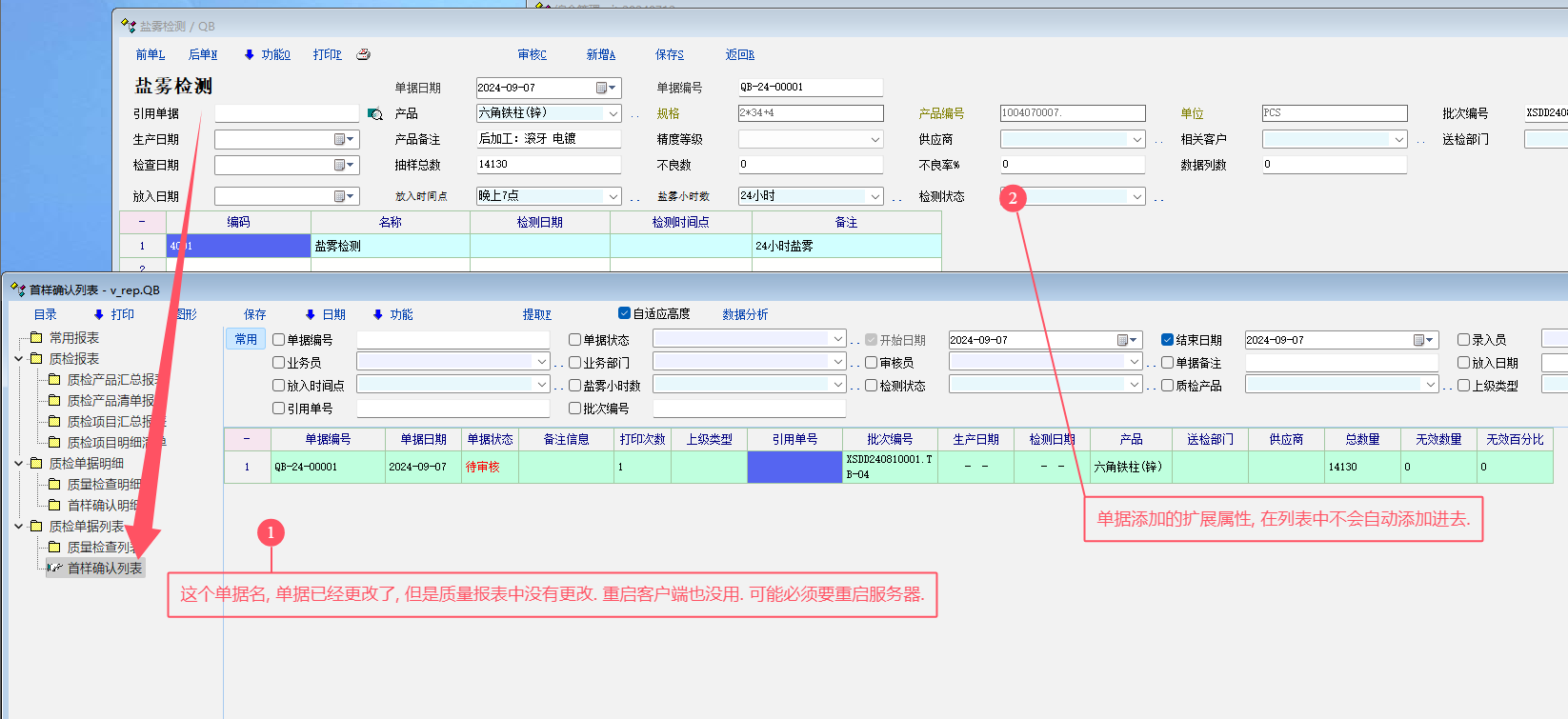 1. 启用额外1个质检单据, , 单据的编号规则中更改了名称(第二次或第三次更名), 重启客户端, 质检报表中, 单据名称仍然未变