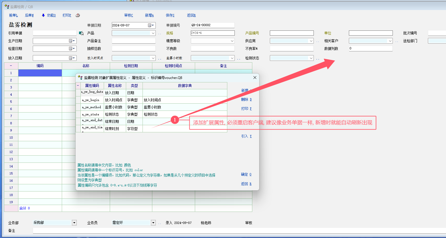2. 质检单据添加了扩展属性, 必须重启客户端, 才会生效.