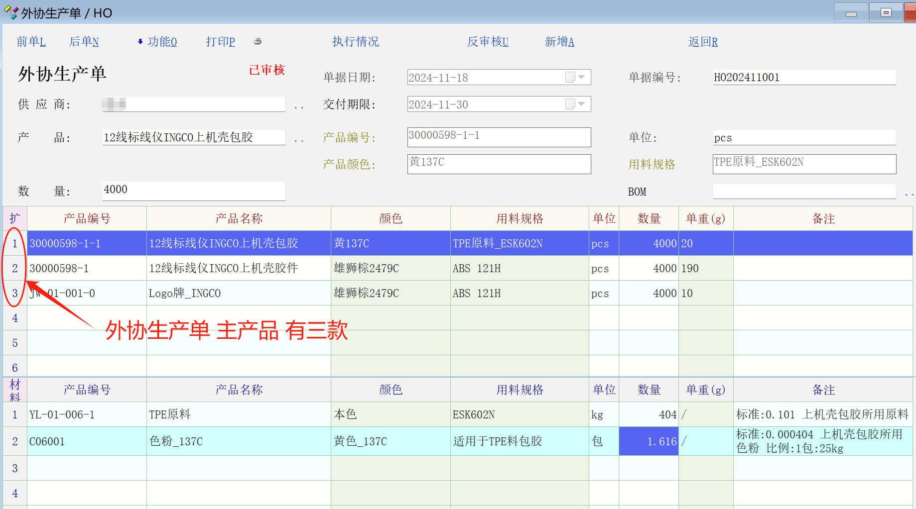 求助_外协生产单中主产品有三款,但外协生产单列表中只显示主产品中第一条_产供销