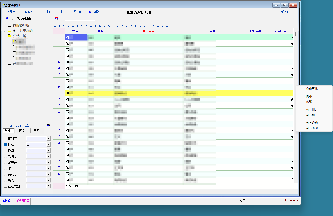 应用场景. 昨天给一个客户升级了系统, 客户提出来, 当表格很多行的时候, 以前的版本可以右键滚动条, 快速跳转. 新版本没有了. 详细看图: 截图是在客户管理中 |