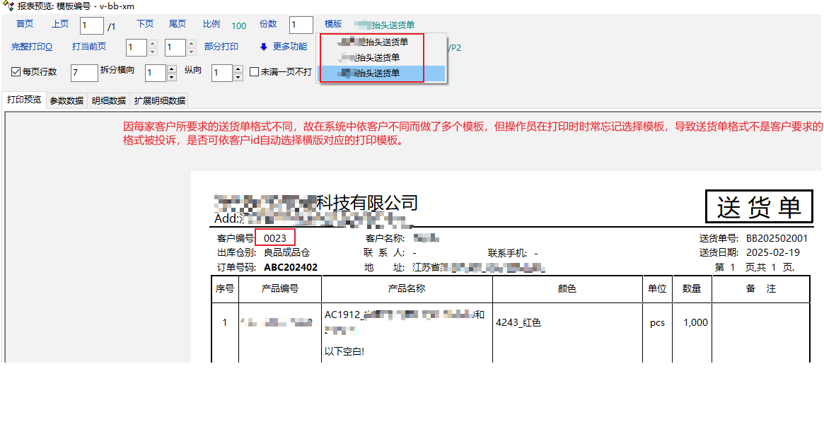 我家客户几乎每家都是自宝义的送货单格式,千奇百怪,10家客户就会有10个模板,因每家的模式不通用,但现在在打印时选择模板容易漏选,导致张三的模板打到李四上面去了。