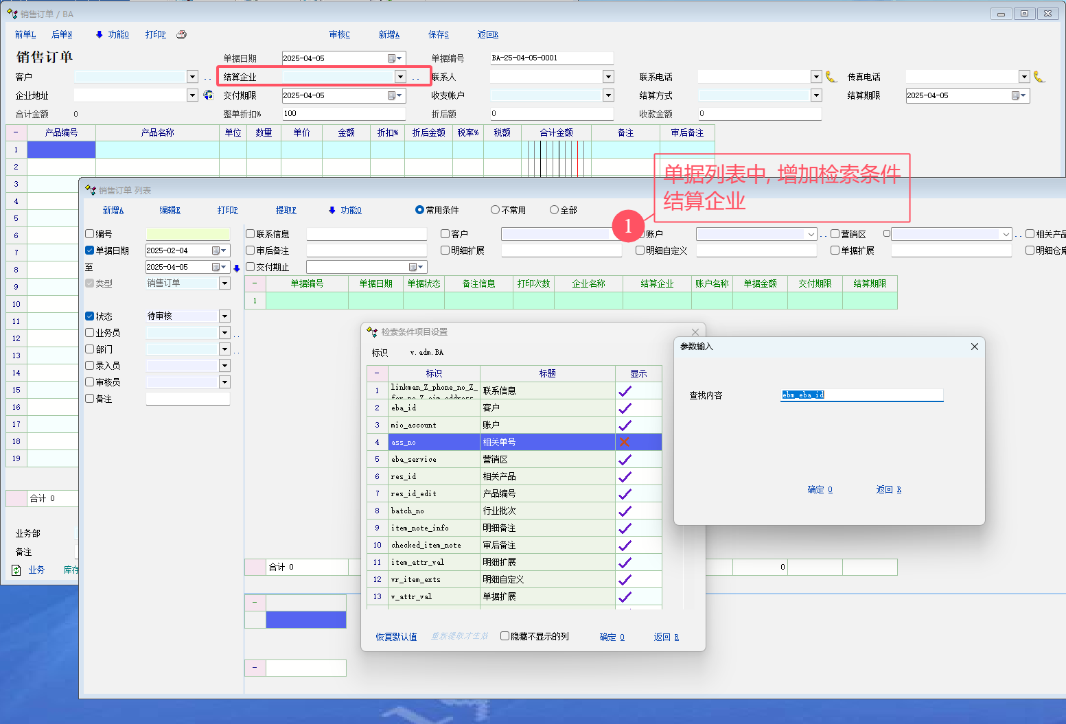 客户在某些单据中显示出结算企业, 有时候检索结算企业一个段时间有哪些单据,