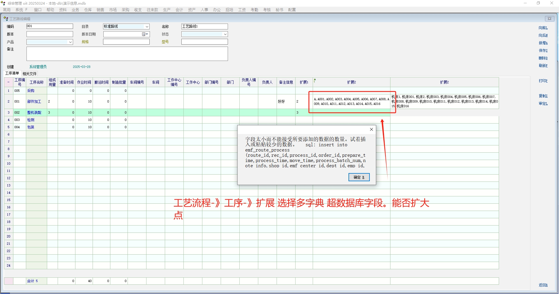工艺流程-》工序-》扩展 选择多字典 超数据库字段。能否扩大点