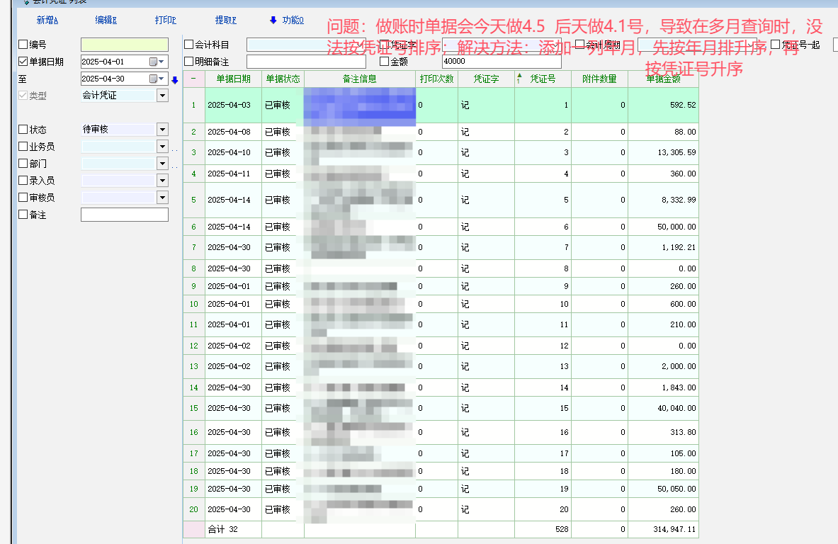解决方法:先按年月升序,再按凭证号升序