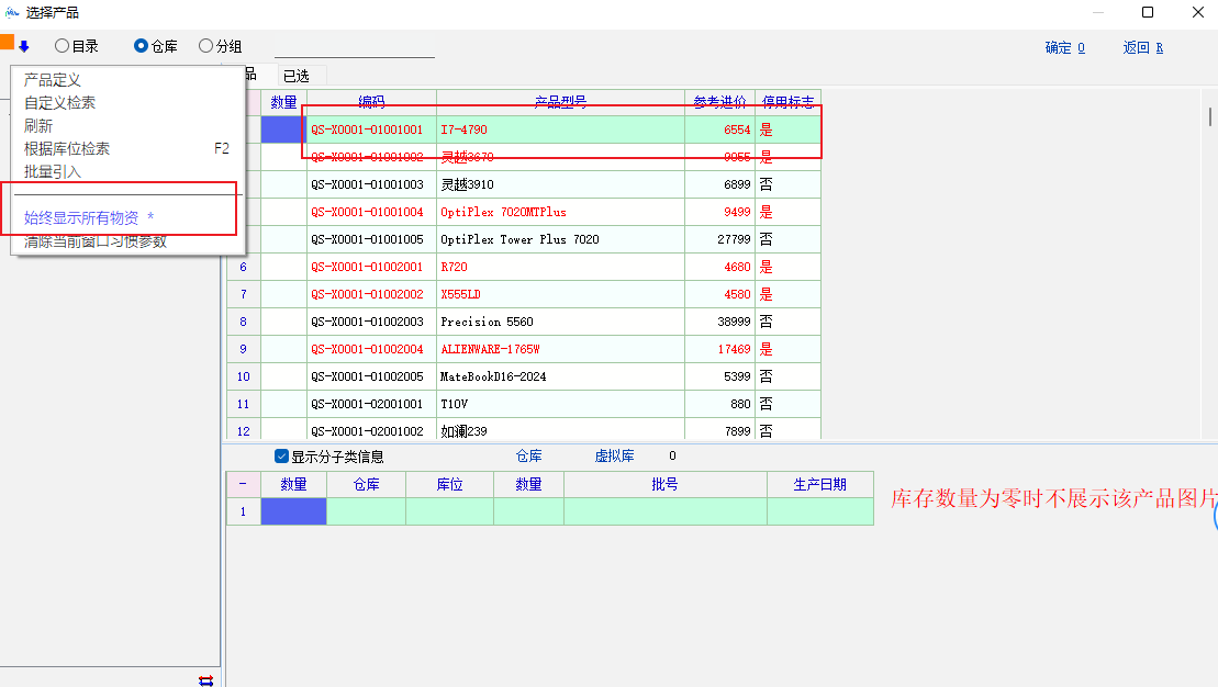 在开单选择产品时,选择始终显示所有物资,选择目录或仓库后,停用产品也显示出来了,能否将停用产品屏蔽百显示出来