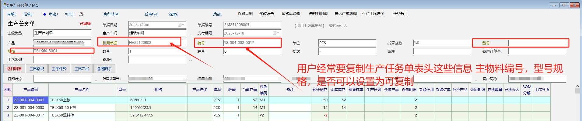 推荐_用户经常要复制生产任务单表头这些信息 主物料编号,型号规格,是否可以设置为可复制_产供销
