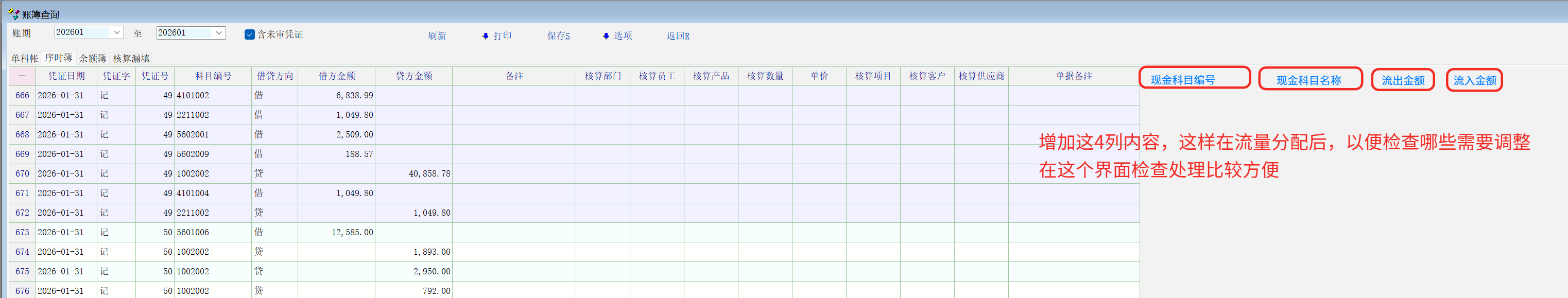 自动处理现金流量数据非常方便,在自动处理完,还需要进行二次检查处理,如果能在序时簿界面能看到现金流量的相关内容,对于检查工作来说是非常方便的,看看能不能增加。