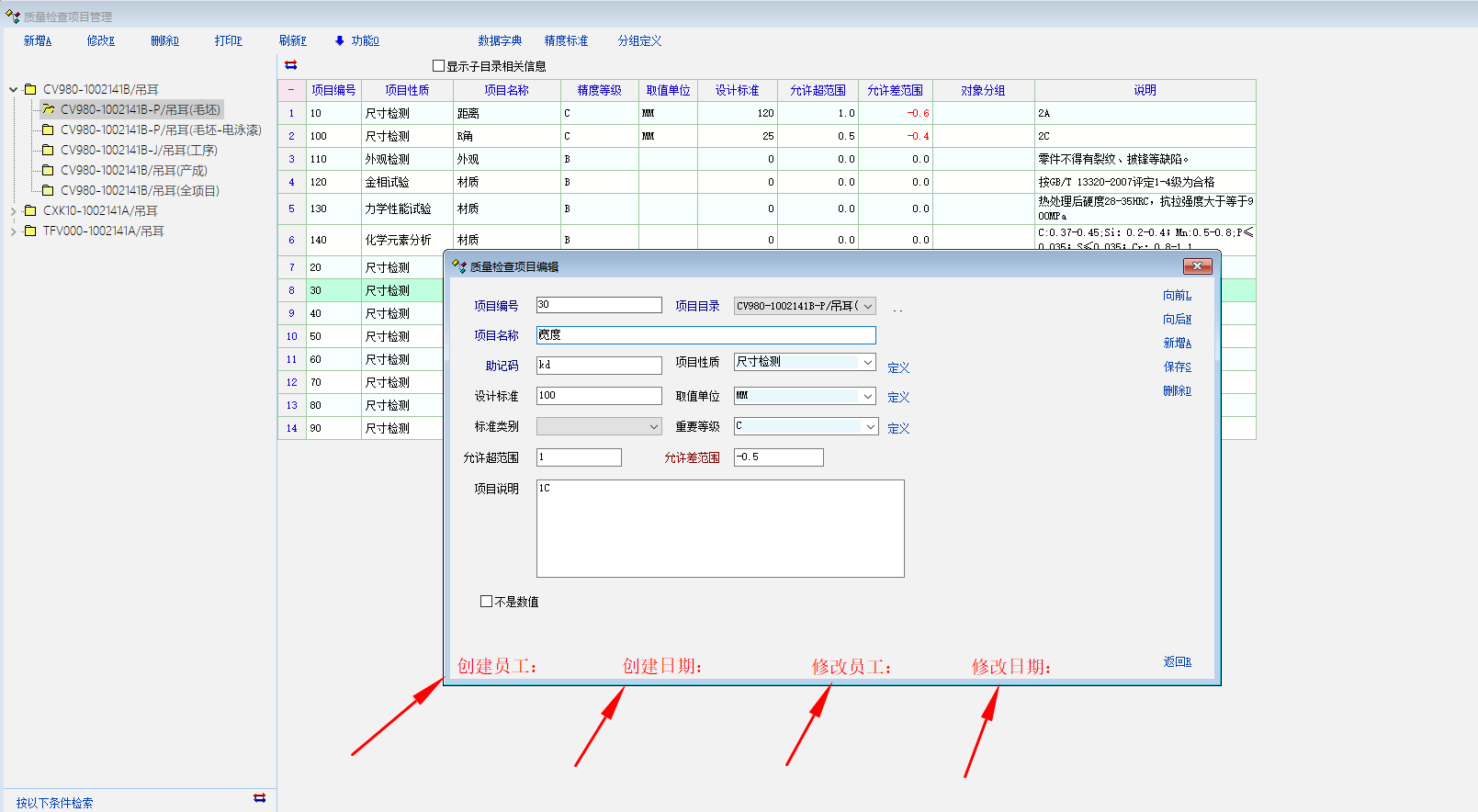 在检查编辑录入后保存,建议增加显示创建员工及时间,如有修改再保存,显示修改员工及时间,方便能检查追溯到质量标准录入源头的制定人。请软件方能增加完善这需求,感谢