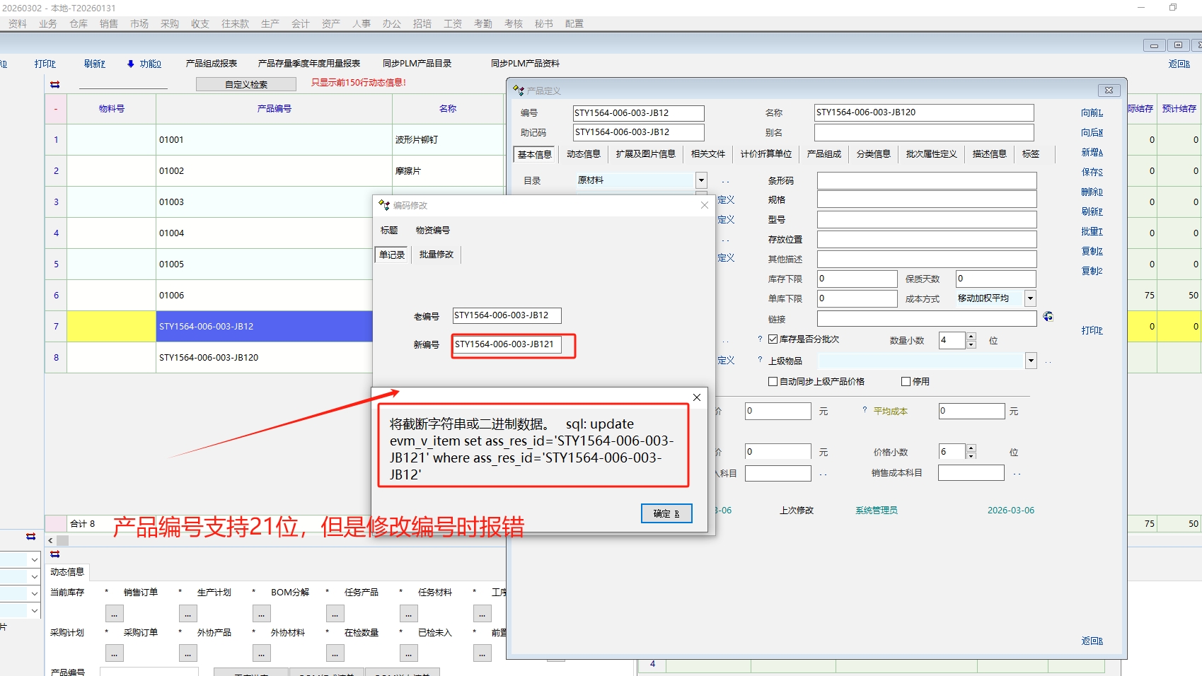 产品编号支持21位,但是修改编号时报错