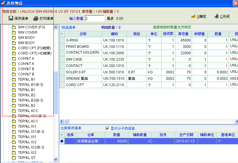 2.现在的每次只能查一个物资 ,但是生产需要 同时查几个物资。因为 有的物品 是共用的。见意 可以在左边的bom文件 那里加个选择框 ,选一个 主物资就在 右边 多出一个 标签  ,可以单独输入数量  ,在最后面有一张总的表格 表示合计数量 。