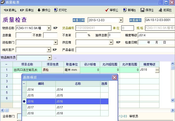 前辈 质量检查单据明细中的 精度等级 选取   不因该是  选定项目 是该 在质量精度标准 管理中直接选取  精度等级