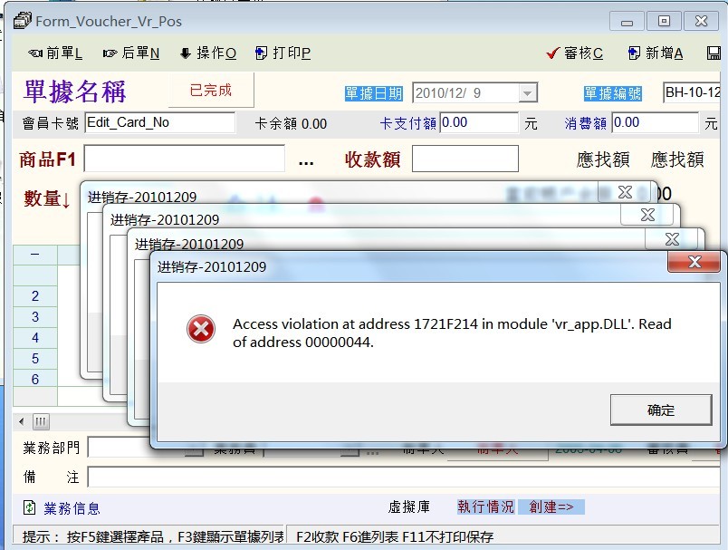 前面我就讲过!我们的软件一直在win7系统下就有这个问题 为了这个问题,我换回了XP 今天我重新安装了win7系统,发现软件在win7下还是出现这个错误 其他的好像正常,就是进软件以后,点POS机销售,就出现这个错误 有时候可以正常使用,有时候不可以! |