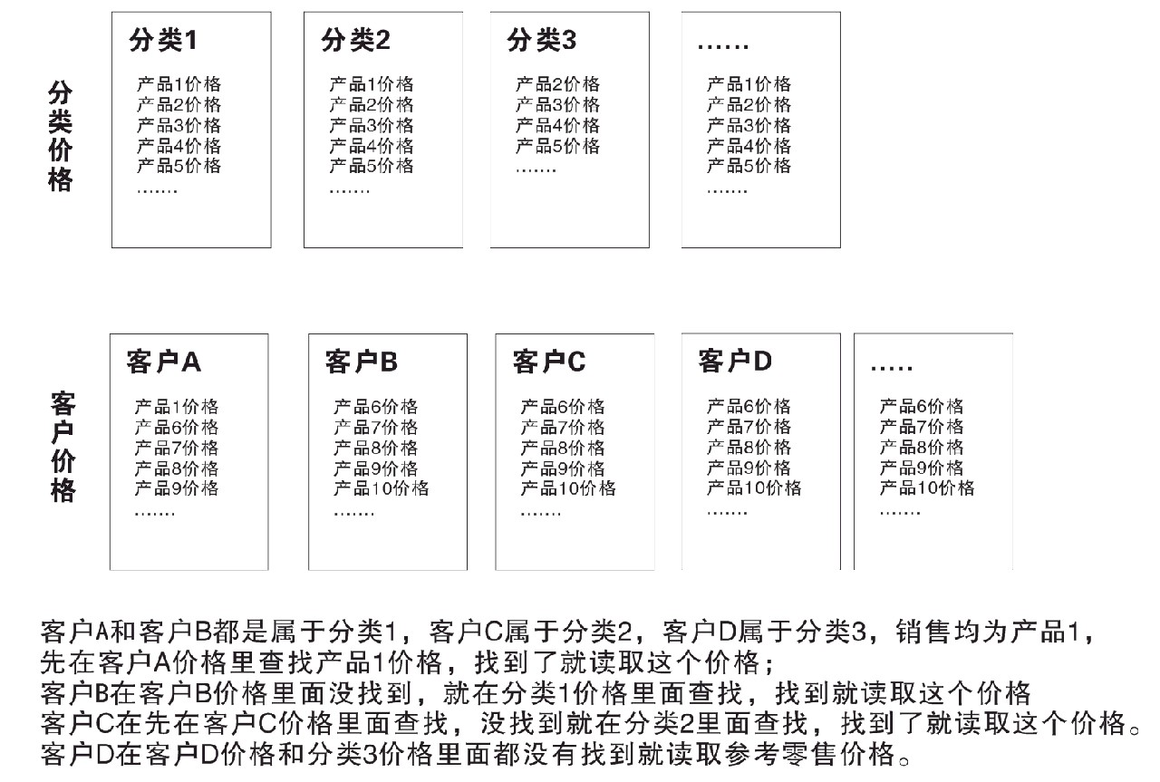 客户C在先在客户C价格里面查找,没找到就在分类2里面查找,找到了就读取这个价格。