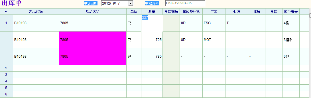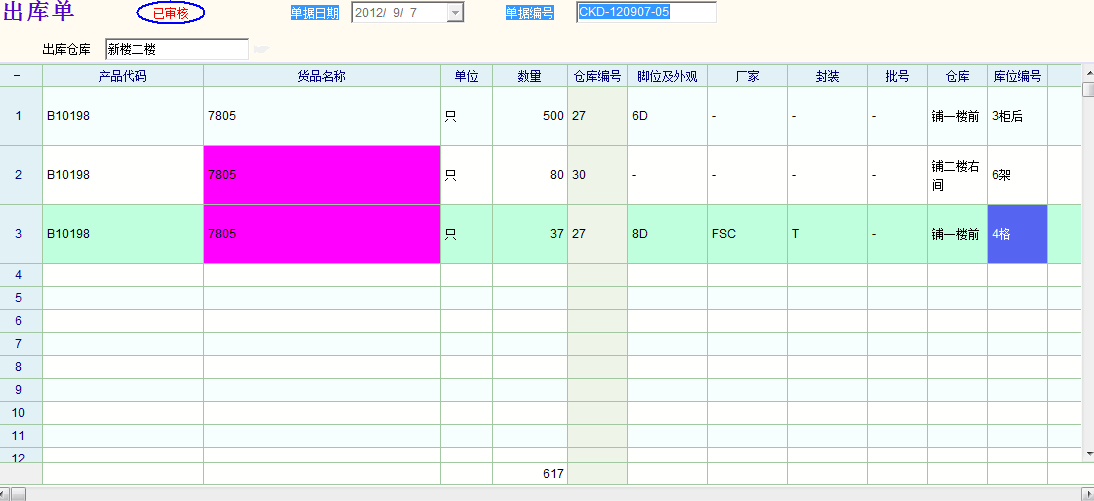 上图是出库单,表头出库仓库是铺一楼前,细目仓库(实际出库仓库)是铺一楼后。 下图是库存报表中出库单明细的检索,显示的出库仓库是铺一楼前,这很让人无所适从。 |