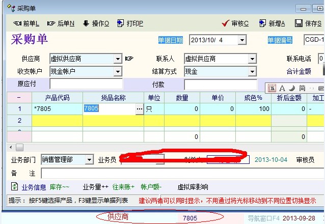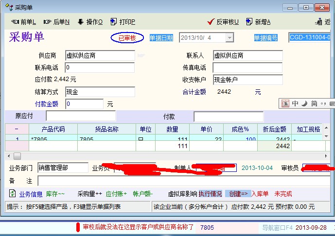 在目前的系统中还有一个问题,当物资单据审核后就没法通过将光标移动到客户(供应商)位置后在横栏上显示客户(供应商)名称,也就没法通过横栏查询详细资料了。