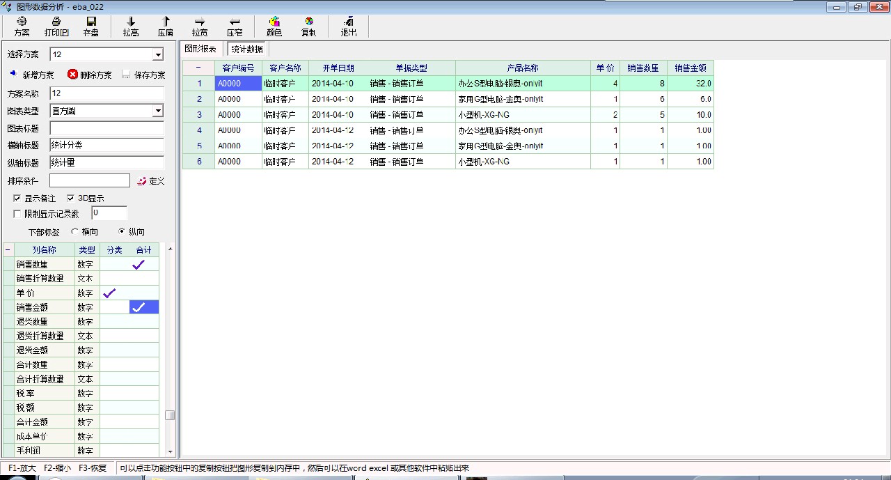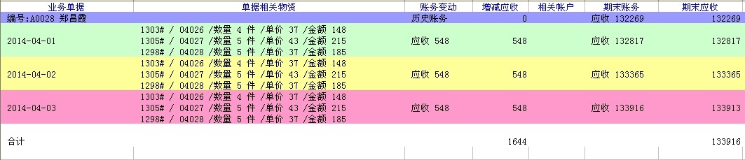 不是啊,是不是我说不清楚,要的是一种日期从1日始到月尾,每天每款多单合计为同一种款式的合计数量、金额,比如我A款式1日发了1单,各种颜色合计18件,乘以单价,总金额。2号我A 款式又给这客户发了3单,合计三单为15+23+47=85件,这表排列应是 1日,A款,18,X20,=360 2日,A款,85,X20,=1700(这行数实为三单同日合计来的) 2日,B款,30,X15,=450 把单据相关物资这列隐藏掉,就看不见什么款式了,只见到金额,而且这种表用途很广的,其他的软件都有 |