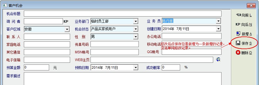 商业管理》客户机会中的保存键有误,当修改某一记录后点击保存键,系统不是保存修改后的记录内容,而是增添了一条全新的记录,并且旧记录也同时存在。