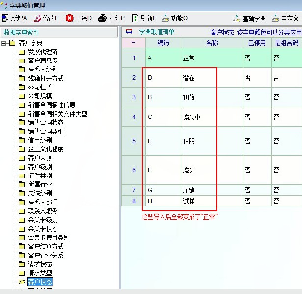 客户管理中,使用导入数据/批量修改功能时,客户状态导入有误,不管有几种客户状态,导入后都只变成为"正常“一种,其它状态都全部变成了”正常“。