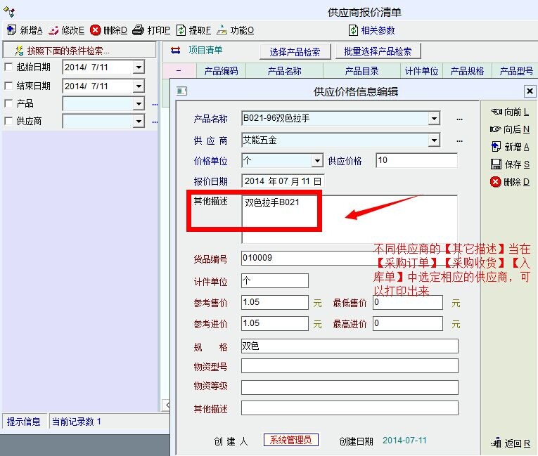 后来发现在【采购管理】【价格信息】中的“其它描述”也可用来当做不同供应商有不同的编码和名称,但在【采购订单】和【入库单】均调用不到。