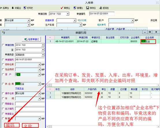 当仓库要入库,则供应商送来的物资编码往往和企业不致,特别是螺丝等等,还有出库,生产人员的叫法也和本公司编码一定相同。建议在单据引用如何下改进。