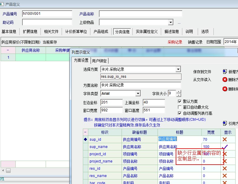 产品定义中的采购记录的显示定制缺少行业属性的显示定制.