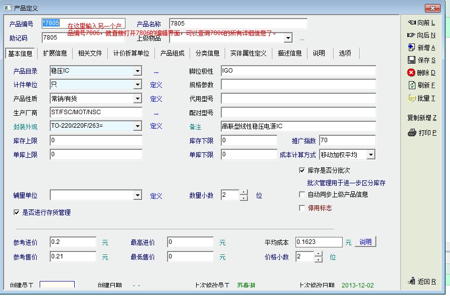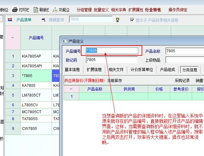 建议新增如图功能:当想查询新的产品的详细资料时,在这里输入系统中原来就存在的产品编号,直接就能打开该产品的编辑界面。这样,当需要查询新的产品详细资料时,就不用到产品资料管理的输入框中输入该产品编号,搜索之后再双击打开,效率将大大提高,操作也非常流畅。