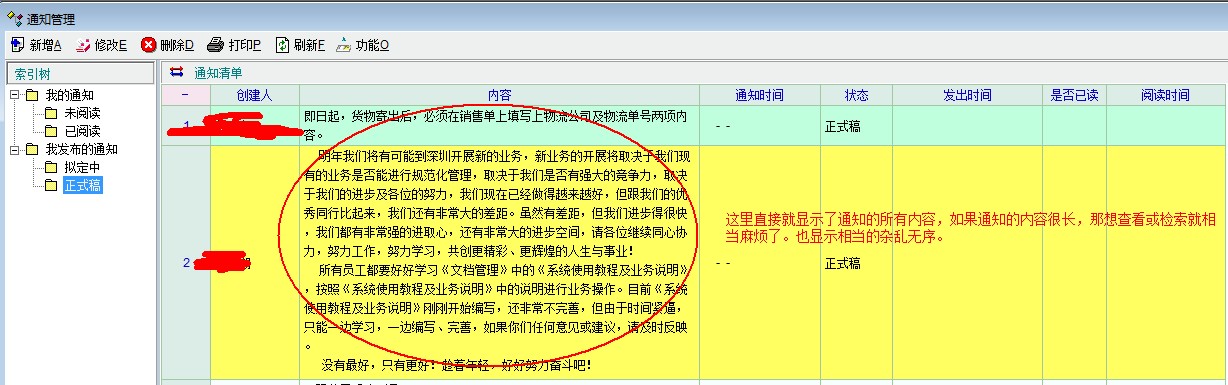 现在的通知,只有通知的内容而没有通知的标题,当要对通知进行分类、归档时,往往没法操作,建议老师给通知增加一个标题,方便对通知进行管理:检索、分类、存档等等一般都需要用到标题。